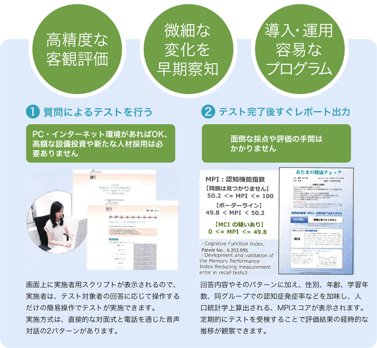 あたまの健康チェックは、有識者、有資格者でなくとも簡易に高い精度で認知機能を確認できるものです。