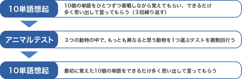 ①10個の単語をひとつずつ復唱しながら覚えてもらい、できるだけ多く思い出して言ってもらう(3回繰り返す)。