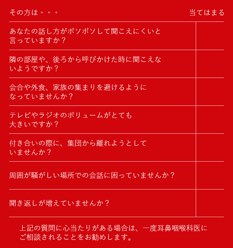 あなたの周りの方が難聴になりはじめていないかどうか、以下の質問で確認してみましょう。