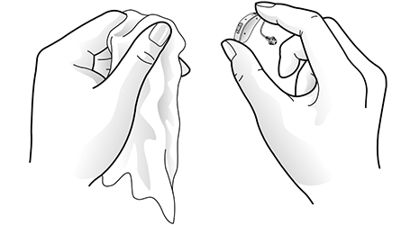 耳あな型補聴器では、補聴器の表面をシェルと呼びます。汚れが積み重なると、正しい位置に補聴器が入らなくなったり、不快になったり、補聴器が動かなくなることもあります。シェルをきれいにするには、クリーニングクロスまたは乾いたティッシュで表面を優しく拭いてください。取りきれない汚れなどは、販売店で取り除いてもらってください。